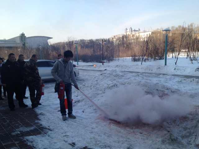 保卫处防火科的工作人员采用现场解说与实际示范的方式具体介绍了灭火器的使用方法和火灾发生后紧急疏散注意事项。