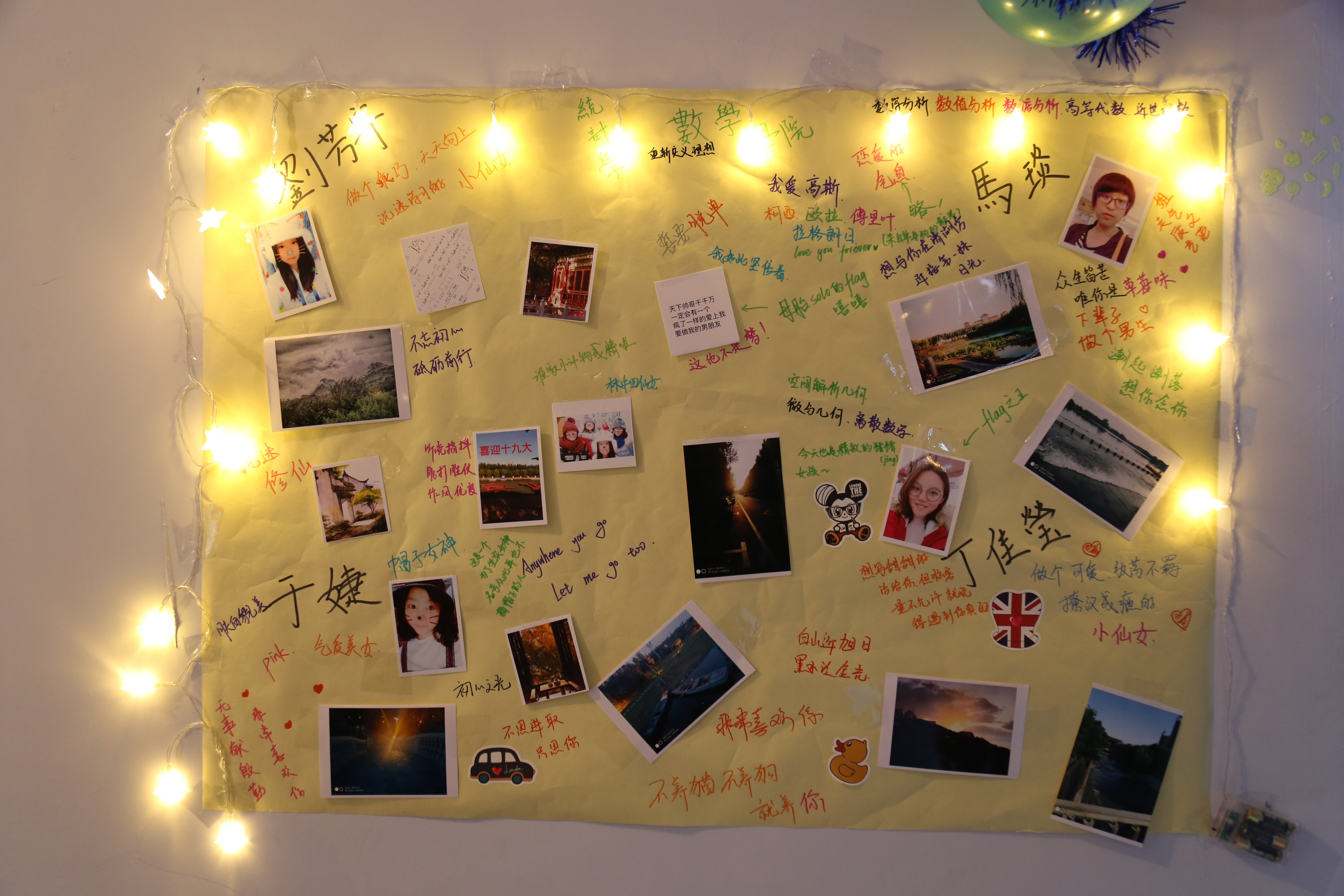 ,刚步入走廊,就已经感受到了同学们的用心,张灯结彩,五彩斑斓,让人很是欣喜,照片墙记录了开学以来的点点滴滴,更有才华横溢的同学自己手绘了海报,每一间寝室同学们都发挥自己的想象,把那一方天地布置成喜欢的模样。有的寝室以