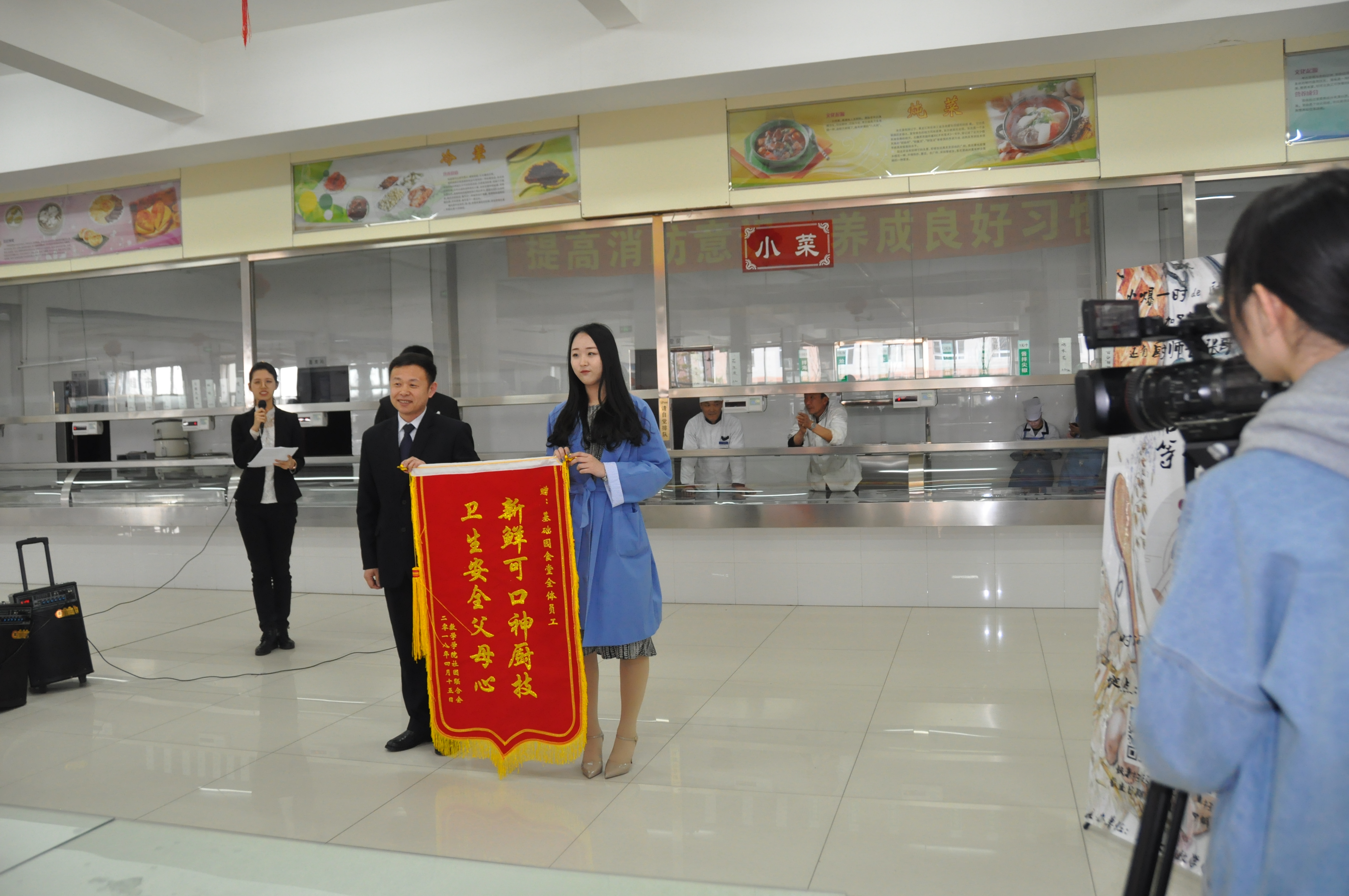 电视台来现场采访报道。社联主席李玉涵为全体员工送上锦旗后,基础园经理带领各位嘉宾及观众参观了后厨以及员工宿舍。宿舍窗明几净,后厨干净卫生,这些都为食堂的食品安全提供了有力保障。
