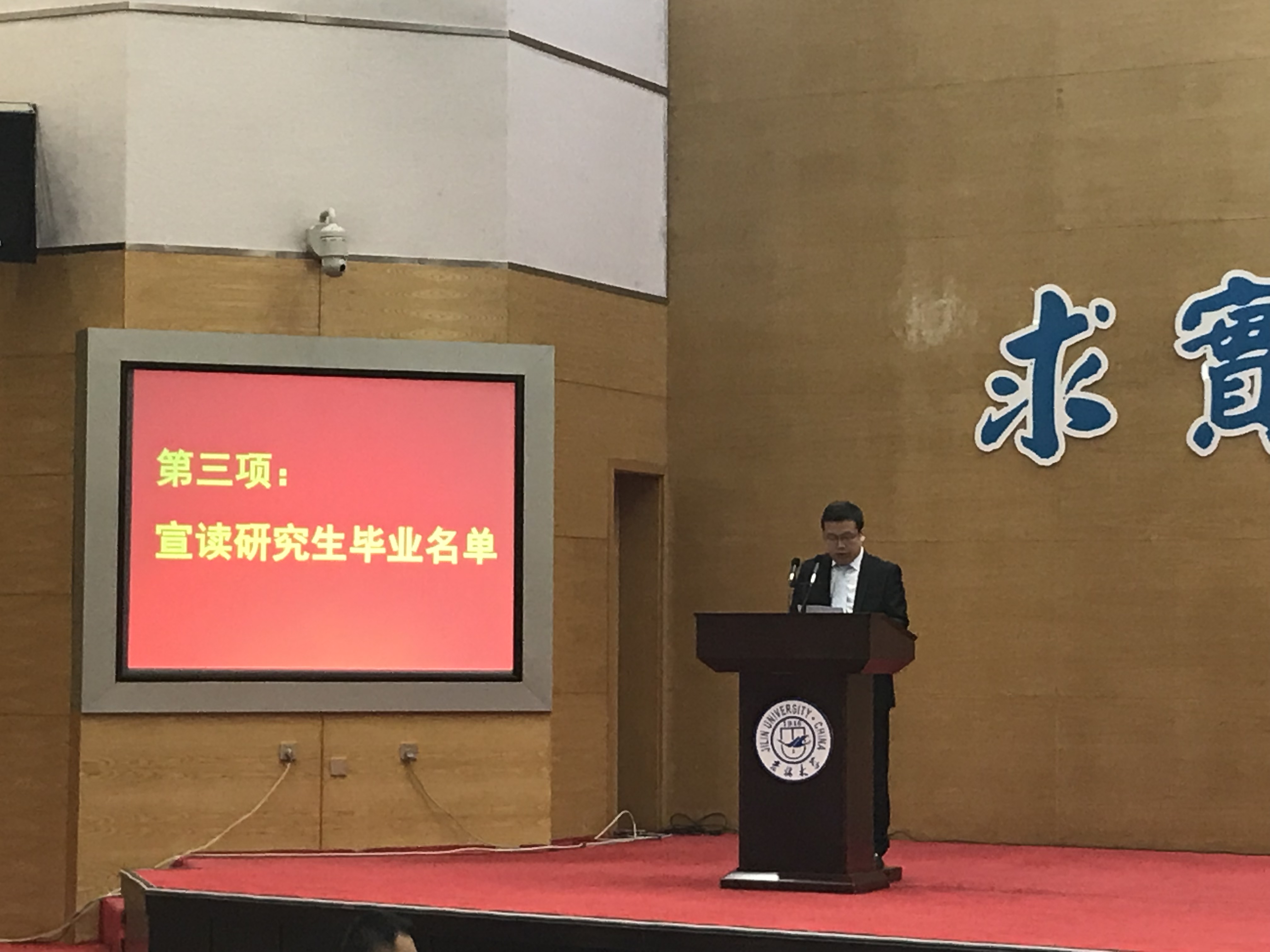 大会首先由副院长王德辉教授和史少云教授老师分别宣读了获得学士学位、硕士学位以及博士学位的毕业生名单。接着,党委副书记王欢老师宣读2018届优秀毕业生表彰决定,并党委书记李晓光教授为获奖代表颁发证书。