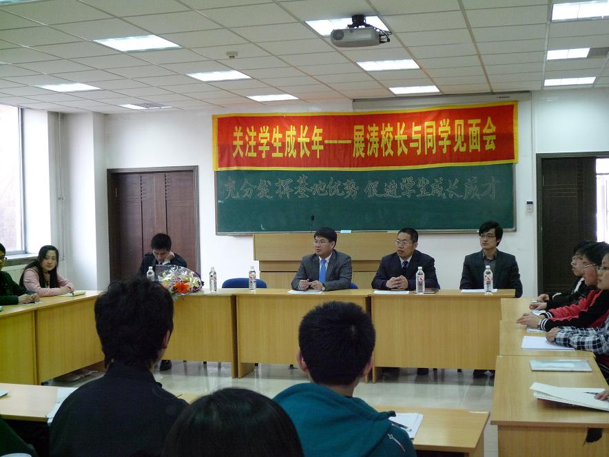 4月11日下午,校长展涛来到香蕉视频 与09级基地班同学进行了以“充分发挥基地优势,促进学生成长成才”为主题的座谈。展涛校长与同学们一起讨论了关于大学生活、学习情况等与同学们息息相关的话题,并对同学们提出了“打好基础”、“经常交流”、“树立信心”等希望。