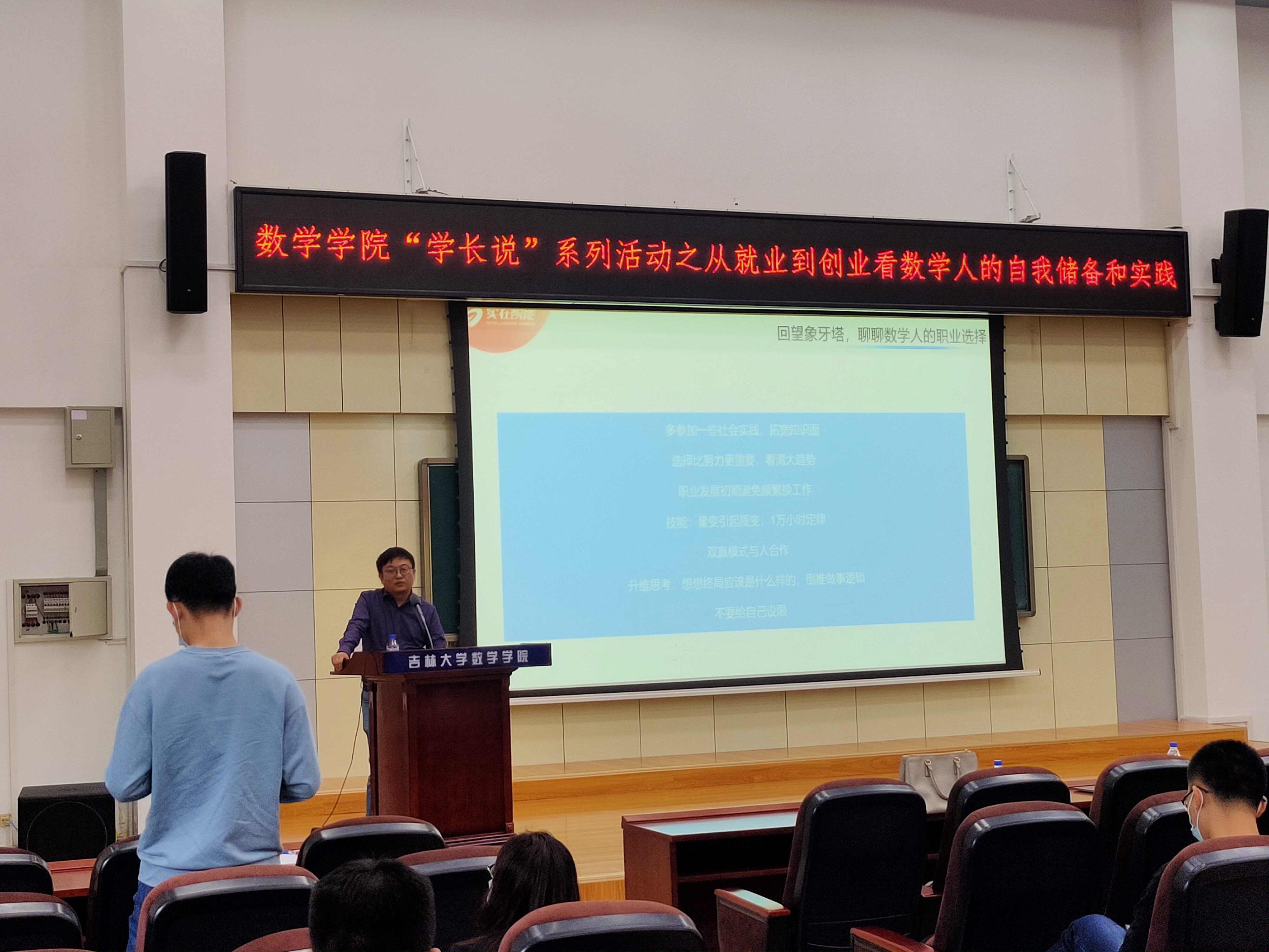策划了“学长说”系列活动,并于2021年9月28日在数学楼二楼报告厅举办了第一期活动。本次活动特别邀请了实在智能公司的创始人兼CEO孙林君以及孙跃刚两位老师作为主讲嘉宾。
