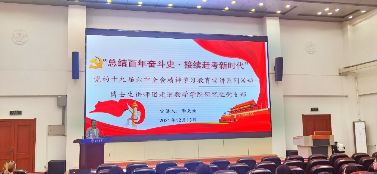 博士生讲师团讲师李天娇博士于数学楼二楼报告厅进行了十九届六中全会精神学习教育宣讲。本次宣讲的主题为“总结百年奋斗史•接续赶考新时代”——新中国以来国家领导人新闻发布的机制演变与基本经验”,香蕉视频