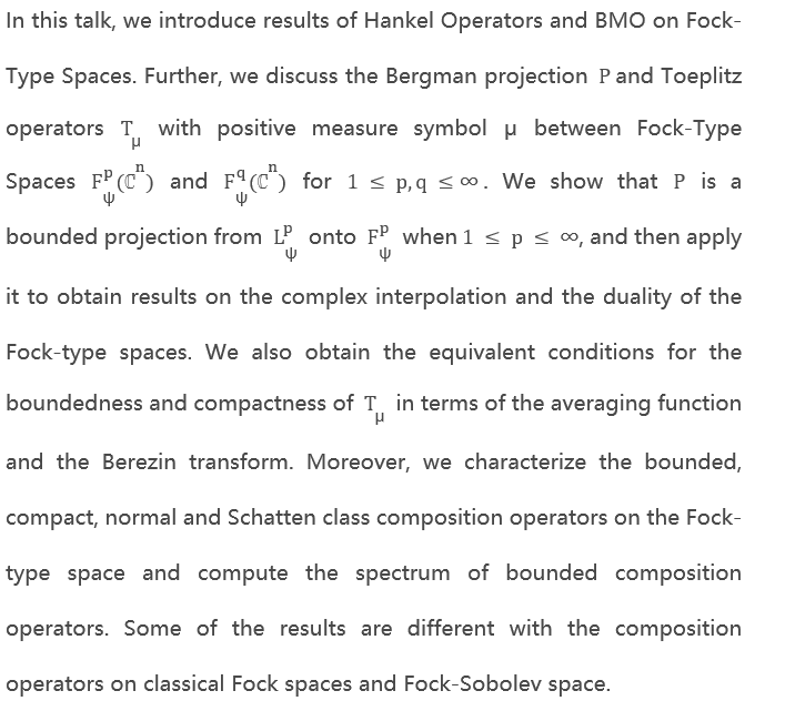 教授、博士生导师。长期从事基础数学研究工作,主要研究方向为算子理论与算子代数。曾到美国进行一年的学术访问,近年来在国内外学术刊物,如《Journal of Geometric Analysis》、《Journal of Operator Theory 》、《Integral Equations and Operator Theory》、《Science China Mathematics》等上发表论文50余篇,其中SCI检索论文30余篇,权威期刊20余篇。先后主持国家自然科学基金3项,获得过霍英东青年教师奖、广州市优秀教师等荣誉。
