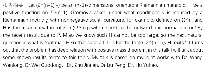 报告题目:Quasi-local mass and geometry of scalar curvature