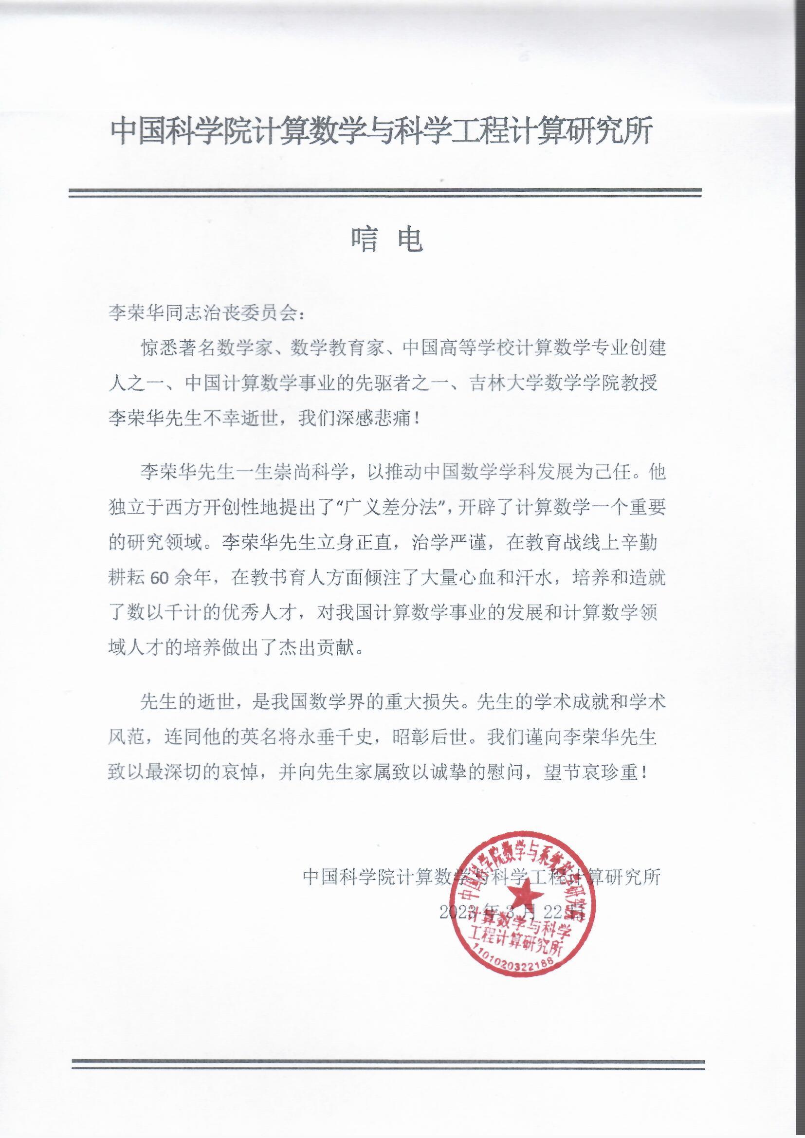 中国科香蕉视频 计算数学与科学工程计算研究所唁电