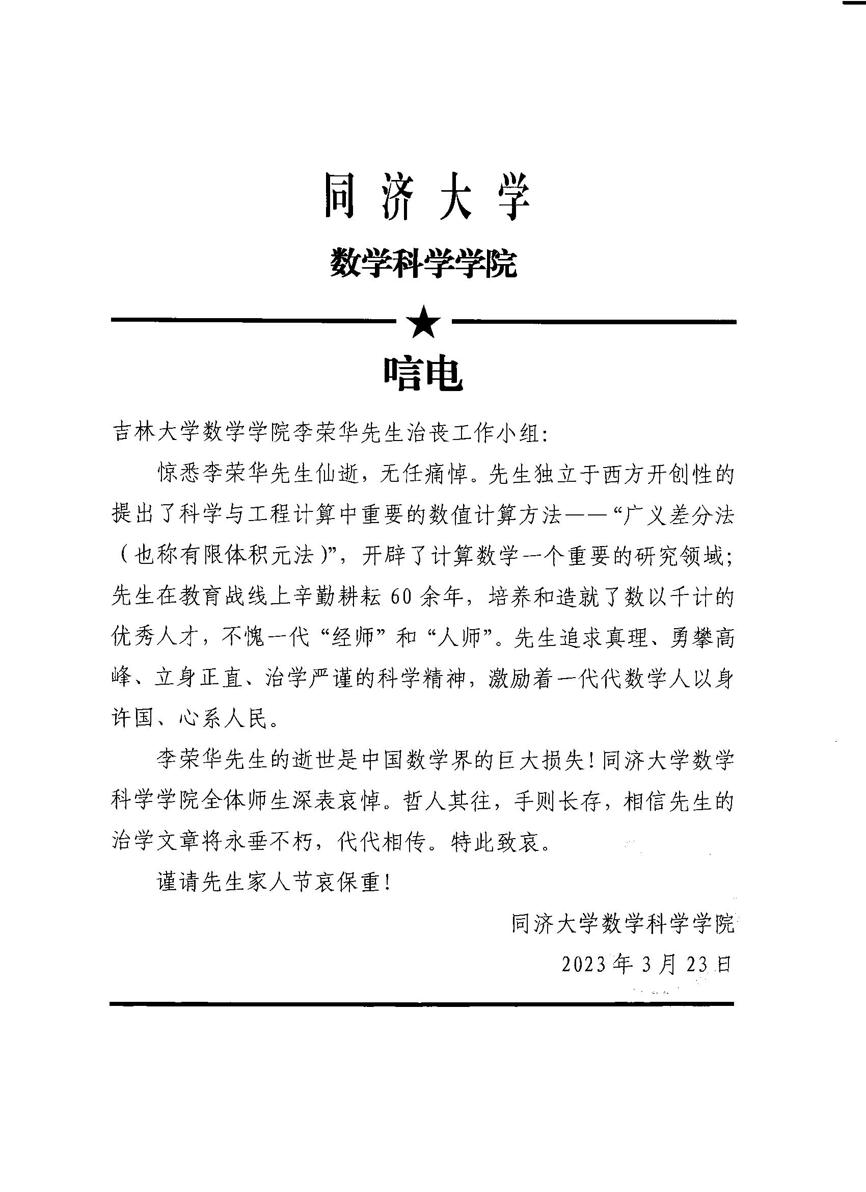 同济大学数学科学香蕉视频 唁电