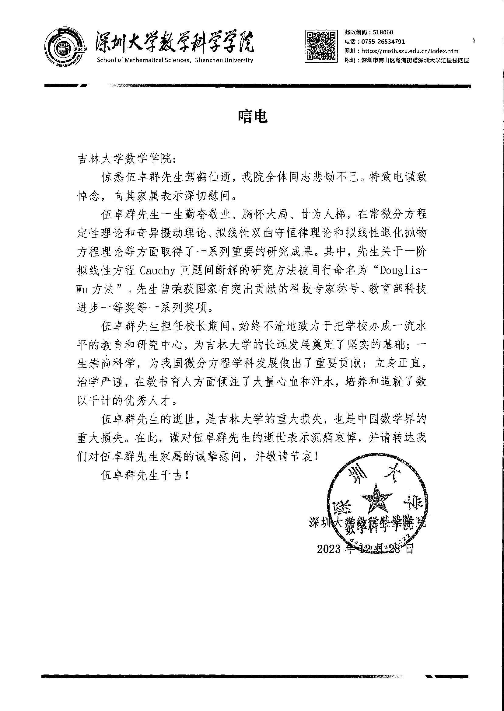 深圳大学数学科学香蕉视频 唁电