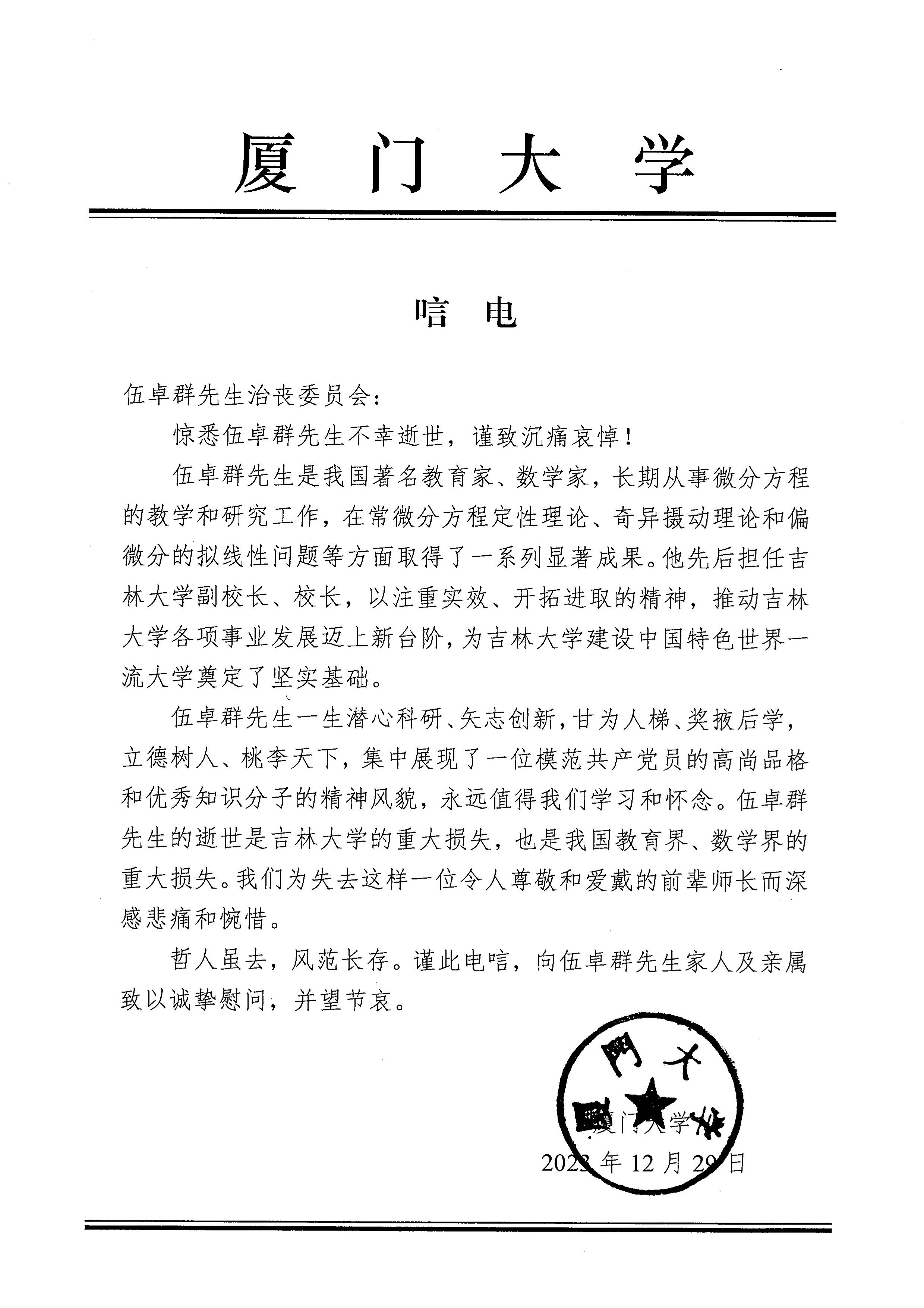 厦门大学唁电