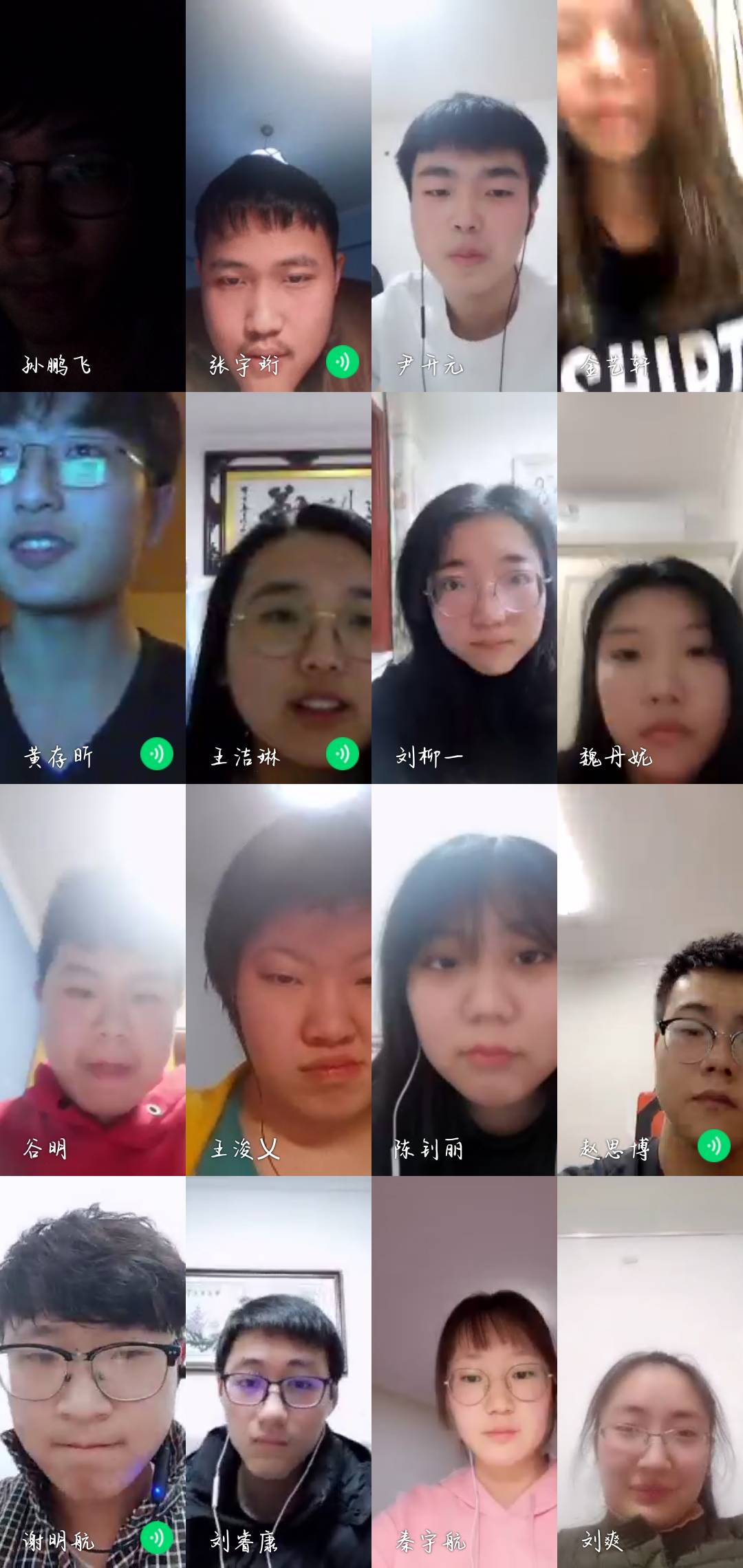 本次出席人员有2018级5班全体同学。同学们都纷纷分享自己疫情期间在家的学习情况,尽管没有人监督,线上学习困难比较多,可大家都坚持着学习新的知识学习新的技能。会议上大伙不仅热情探讨最近所学课程,还探讨了国家最新的形势,习主席发布的最新指示,期间还不乏趣味活动,欢乐而且有序