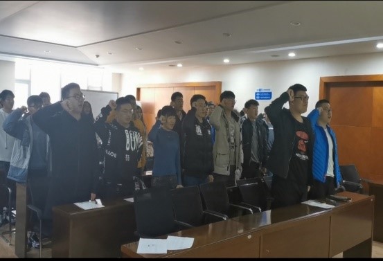 本科学生第一、第二党支部全体党员参加。全体党员佩戴党员徽章,面对党旗,庄严举起右拳,在第一党支部组织委员付豪的领誓下,庄严宣誓: