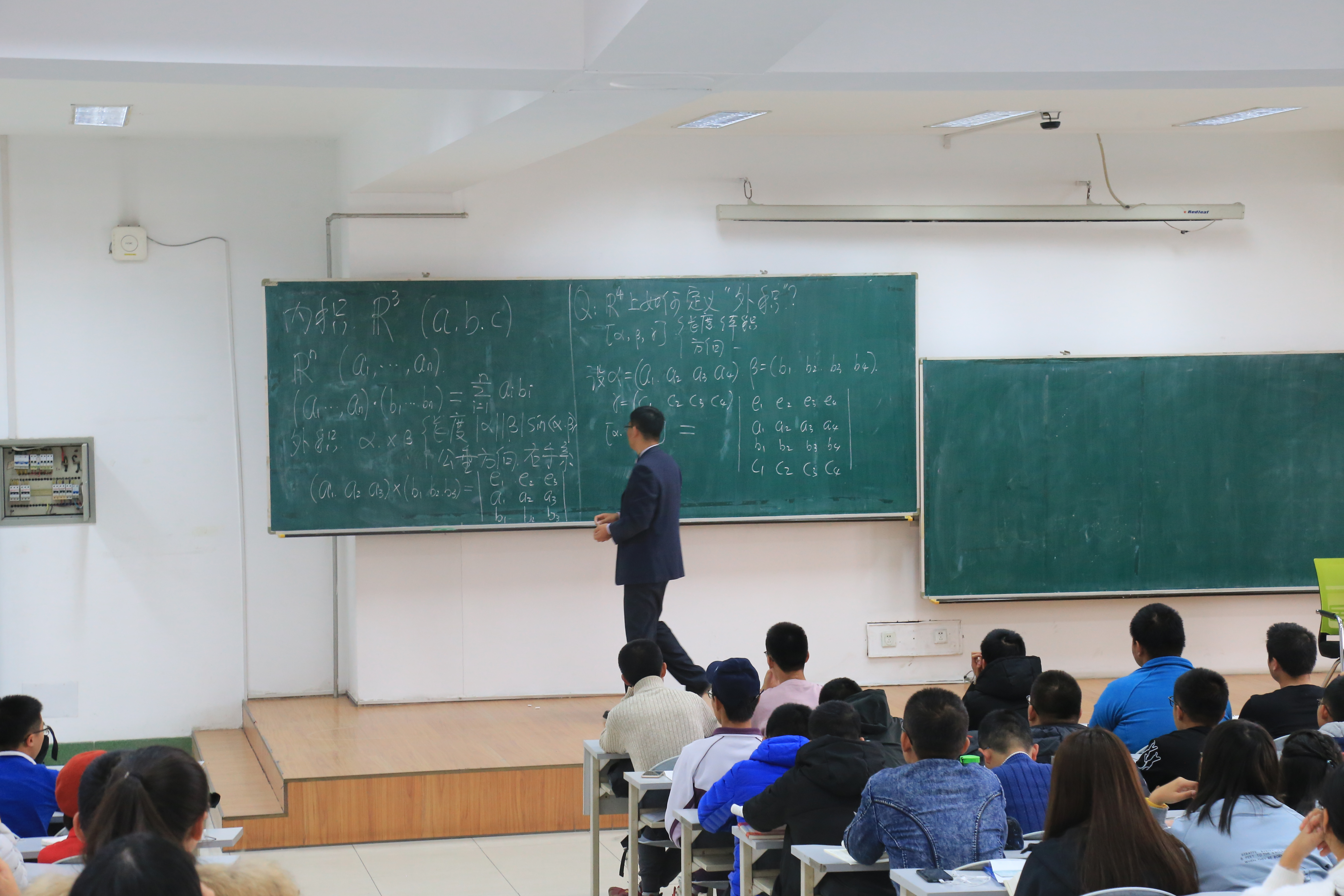 讲座的第一部分由生云鹤教授主讲。生云鹤教授以“不忘初心”为主题,鼓励同学们要坚持自己最初入学时的信念,坚持自己的志向,坚持自己对于数学的热情,不忘初心,尽心尽力地把大学之路走好。在为新生们奉上开学以来第一碗“心灵鸡汤”后,生教授从空间几何解析中的内外积知识入手,以学生刚刚了解的三维向量空间上的内外积知识为基础,引导学生理解n维向量空间、独立思考更高维数向量空间上的内积、外积定义。生教授在讲座中强调,要学好数学,就要学会理解数学,特别要学会直观地理解。生教授还倡导同学们在日常学习中积极讨论。讲座现场,同学们两两一组,在生教授的指导下对于n维向量空间中内积的定义做出激烈讨论。