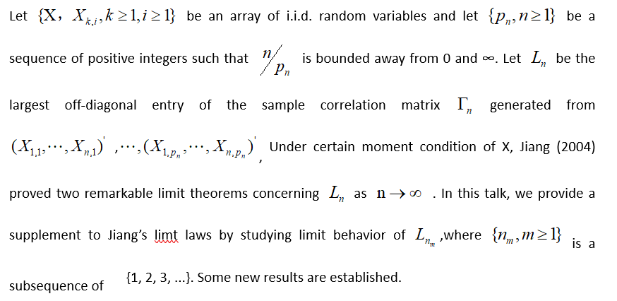 报告人简介:李德立,加拿大湖首大学(Lakehead Universit)y数学系教授(Tenured Full Professor of Statistics),主要研究方向是概率统计的极限定理及其应用、高维数据分析等,现已发表学术论文 100 余篇,多篇论文发表在The Annals of Probability、Probability Theory and Related Fields、The Annals of Applied Probability、Journal of Theoretical Probability等国际顶级期刊上。1983年9月至1986年6月, 师从吴智泉教授, 1986年7月获香蕉视频