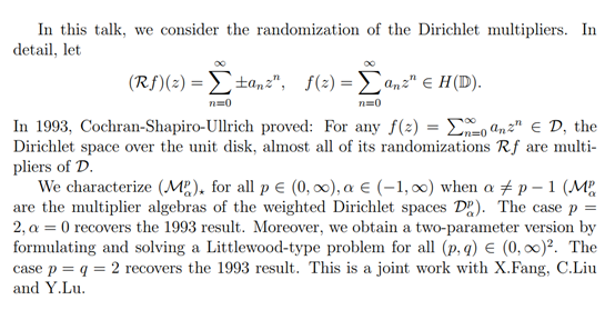 教授,博士生导师,主要从事函数空间上算子理论以及随机解析函数研究。近年来在 IMRN, JFA, TAMS等国际数学刊物上发表论文十余篇,主持4项国家自然科学基金项目。
