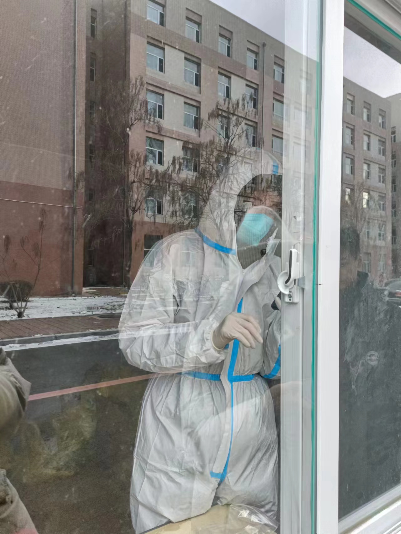 的40名志愿者们就在各个核酸监测点完成集结,他们在本就厚重的羽绒服外穿上防护服,每个同学们面临的都是将近5小时不能喝水、不能脱下防护服,还要在东北11月的凌冽寒风中坚守,即使手被冻僵,面罩上已有一层薄薄的冰,但是我们的数学大白们仍没有一丝松懈的积极配合着检测点医务人员的工作。2021级研究生杜美璇同学表示:“香蕉视频