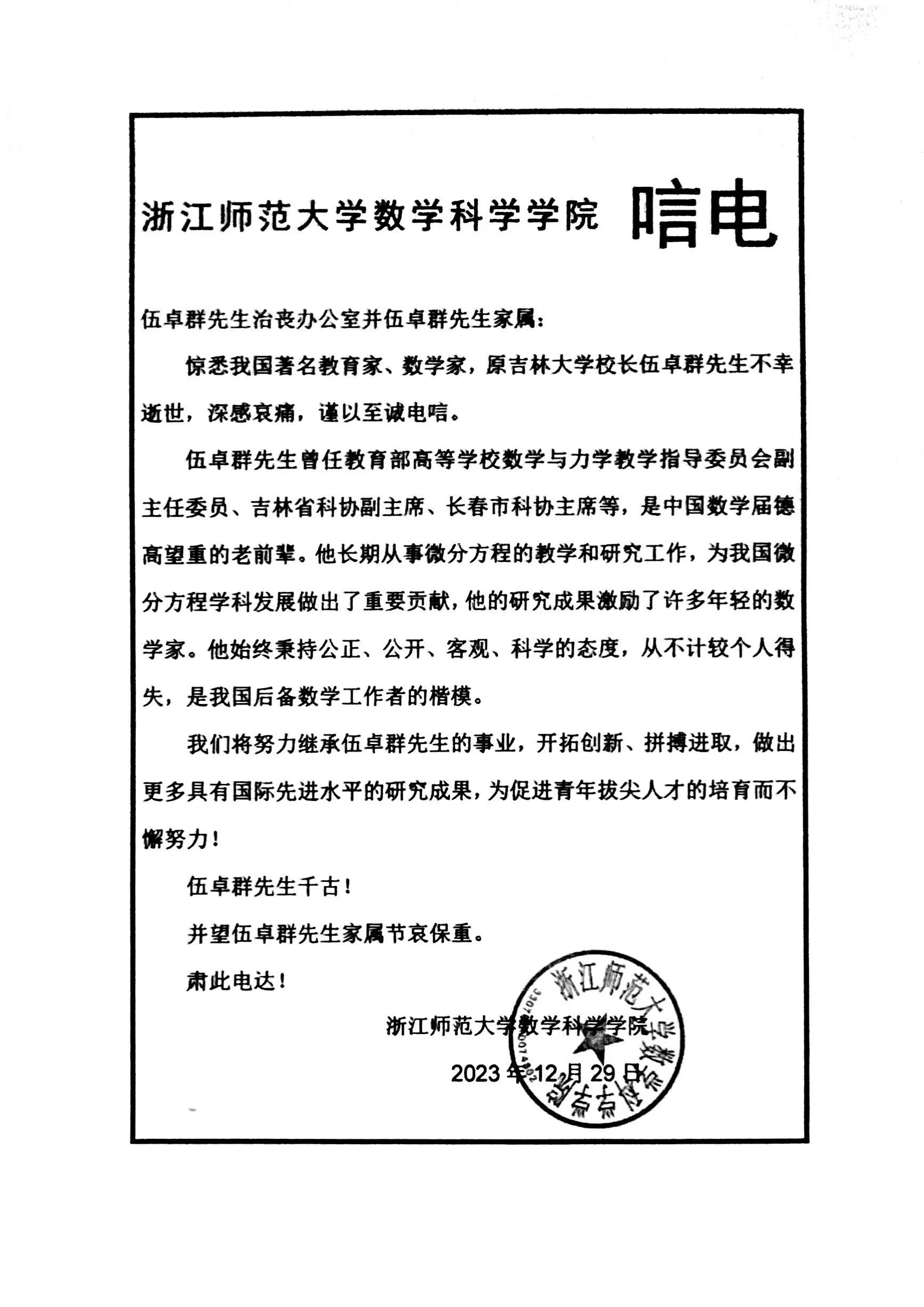 浙江师范大学数学科学香蕉视频 唁电