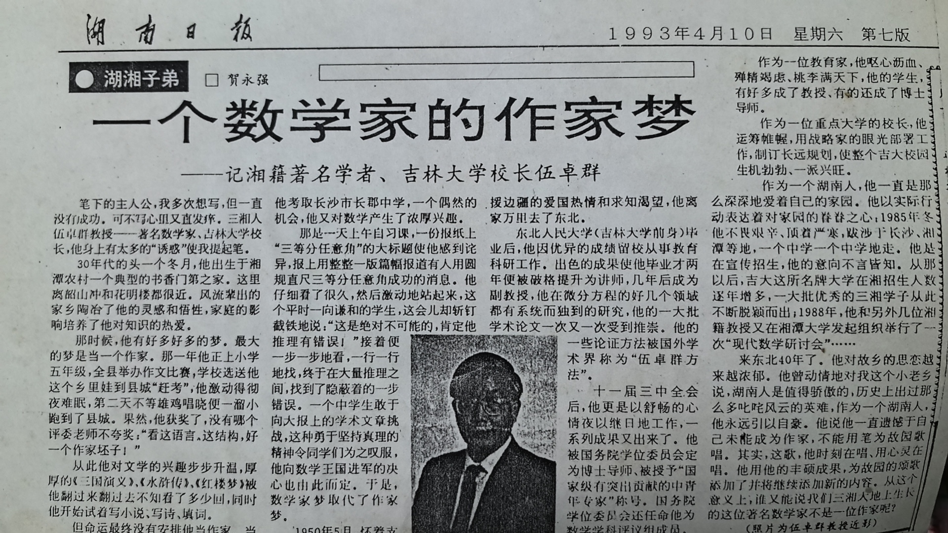 这是当年我上大学期间在家乡的报纸上写的一篇关于伍校长的文章。现在看起来,写得很雅嫩,不足以描述伟大的伍校长的神韵,但也觉得很骄傲,很亲切,至少让不少读者尤其是家乡的读者知道了伍校长数学之外、教书育人之外的一个侧影。谨以此旧文深切缅怀沉痛悼念我无比敬爱的伍校长老前辈!